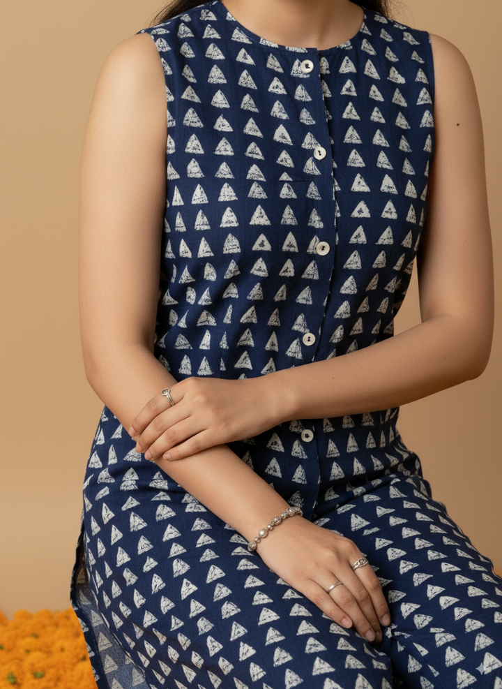 Elevate your wardrobe with this Blue Cotton Printed Co-ord Set featuring a striking geometrical block print. Crafted from breathable cotton, this two-piece set offers comfort and style in perfect harmony. Its lightweight fabric and timeless pattern make it ideal for both casual outings and relaxed gatherings, ensuring you look effortlessly polished.