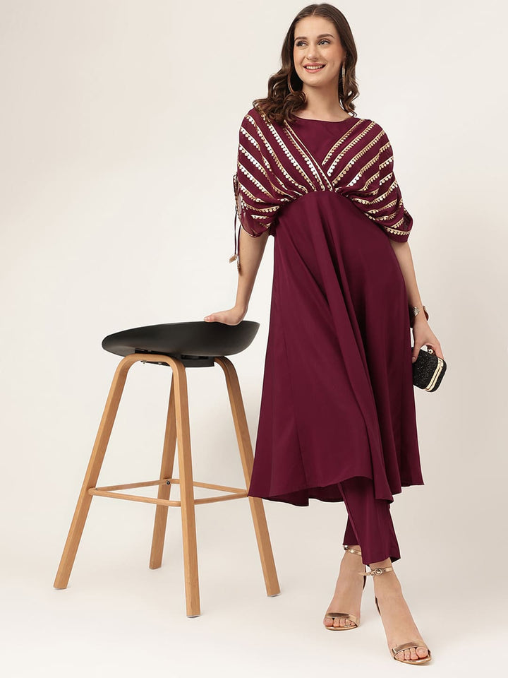 Introducing our stylish Maroon Polycrepe Kurti with Pants, perfect for women who want to look fashionable and feel comfortable. The kurti is made of high-quality polycrepe material, known for its softness and durability, making it the ideal choice for casual wear. The maroon color adds a touch of elegance to the outfit, while the included pants complete the look for an effortless, put-together ensemble. Whether you're going out for a casual lunch with friends or attending a family gathering, this kurti with pants set is sure to make you stand out in style. Don't miss out on this versatile and chic addition to your wardrobe.
