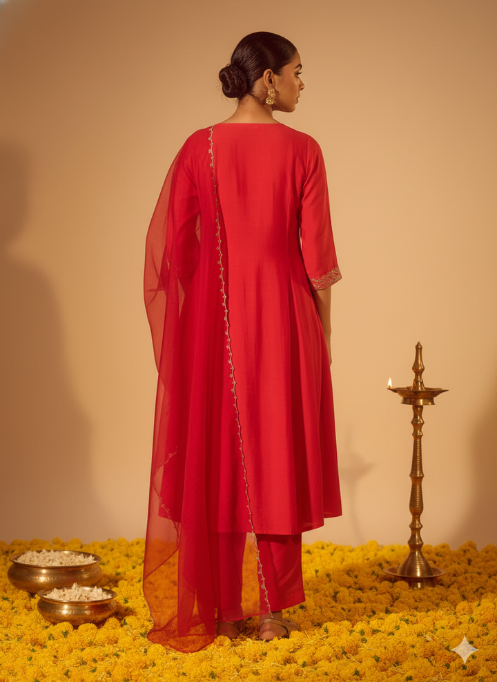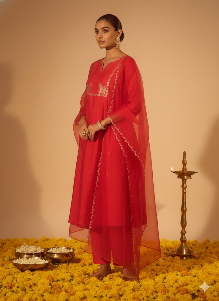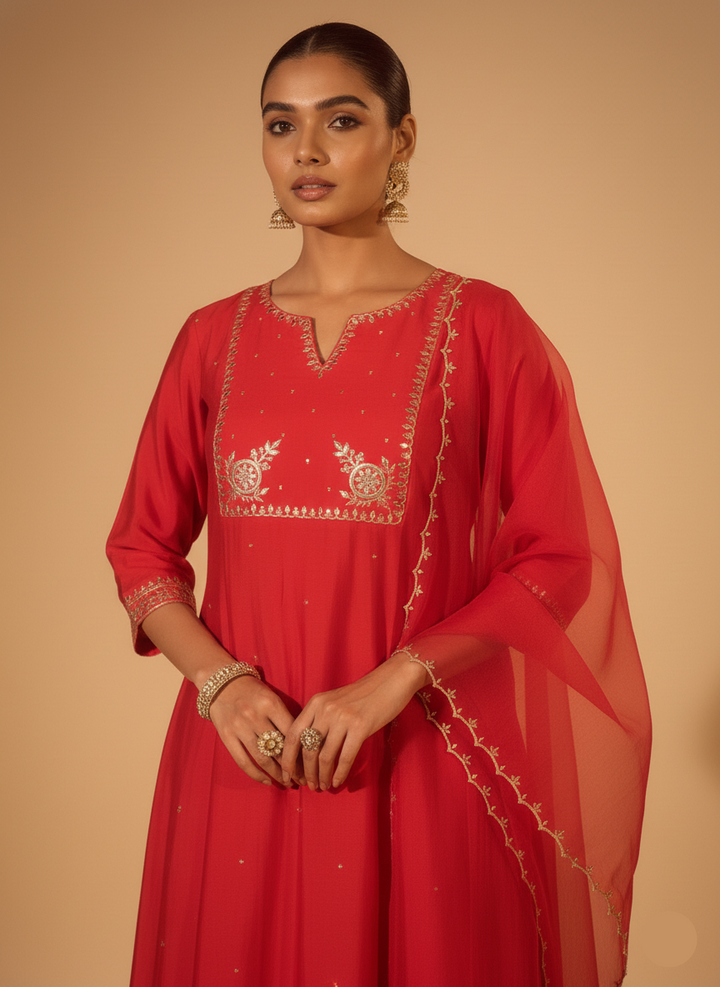 Elevate your festive wardrobe with the Red Chanderi Embroidered Festive Suit, featuring a graceful A-line silhouette that flatters every figure. Crafted from luxurious Chanderi fabric, this suit showcases intricate embroidery that adds a touch of tradition and elegance. Complemented by a delicate organza dupatta, it delivers an exquisite combination of texture and style, perfect for special occasions and celebrations. This ensemble combines comfort with sophistication, ensuring you stand out with refined charm.